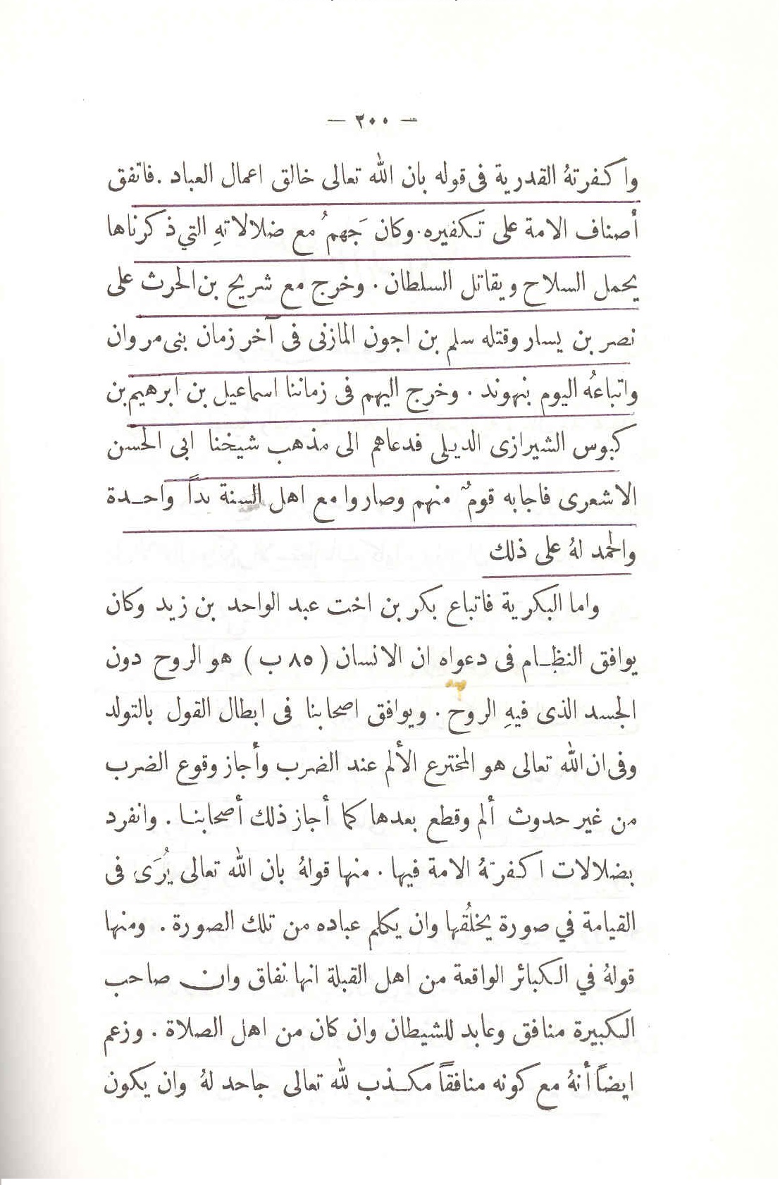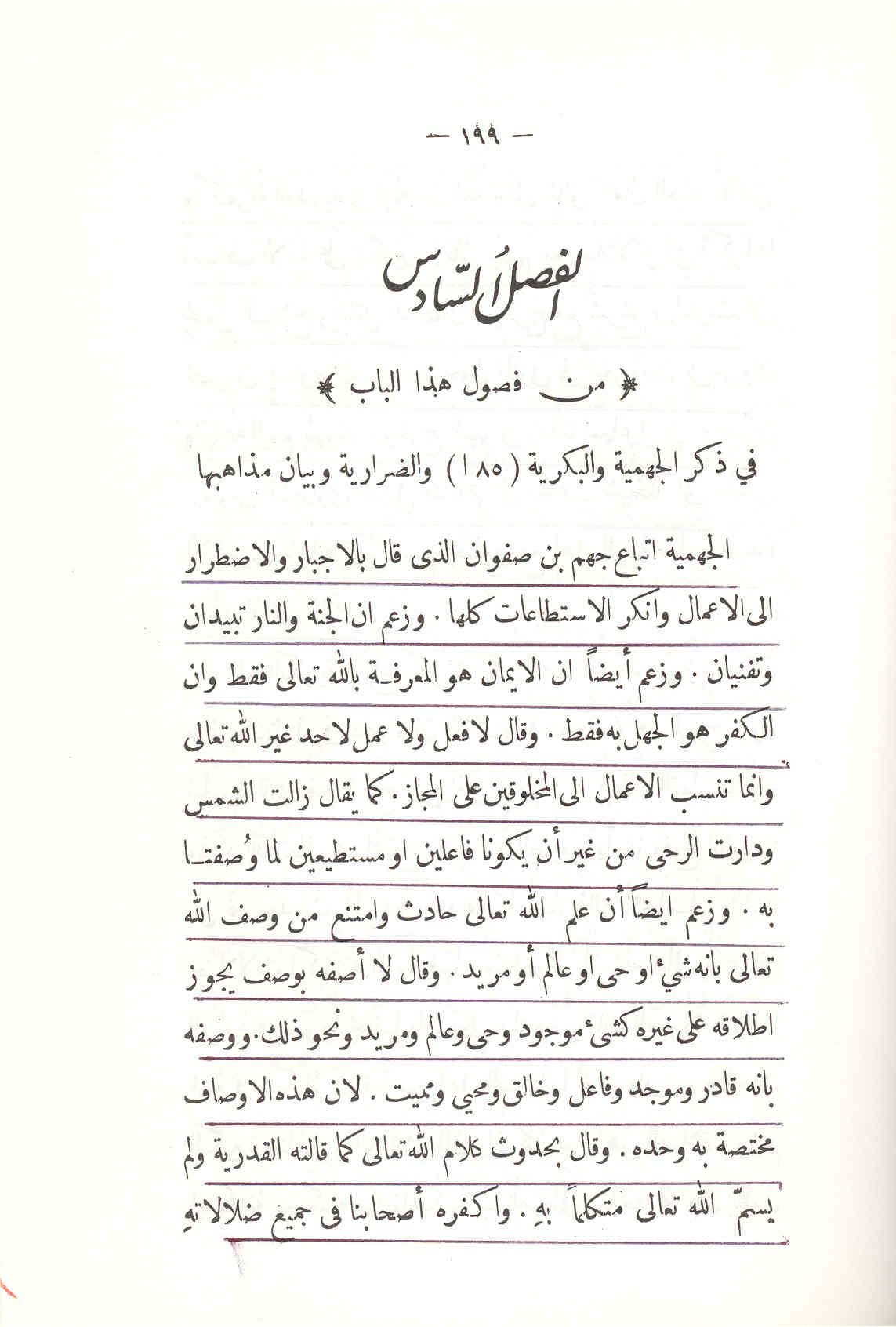 ’’Die Jahmiyyah sind die Anhänger von Jahm bin Safwaan (gest. 128 n.H.), der sagte, dass die Menschen gezwungen sind zu ihren Handlungen, und er hat jegliche Fähigkeit der Menschen geleugnet. Er behauptete auch, dass das Paradies und die Hölle zu einem Ende kommen wird. Er behauptete ebenso, dass der Glaube (Iman) nur aus der Erkenntnis Allahs besteht, während Unglauben (Kufr) die Unkenntnis von Allah sei. Er sagte, dass niemand etwas tut, außer Allah und dass die Menschlichen Handlungen nur Metaphorisch seien, in der gleichen Art und Weise wie wenn man sagt, ‘‘Die Sonne ist Untergegangen‘‘ oder die ‘‘Mühle hat sich gedreht‘‘, ohne eine tatsächliche Handlung oder Fähigkeit von ihnen. Er behauptete auch, dass Allahs Wissen einen Anfang hat und er verbat den Menschen, dass sie Allah mit Leben, Wissen oder Willen beschreiben. Er enthielt sich zu sagen, dass Allah Shay (Etwas) ist oder dass Er Hayy (Lebendig), Alim (Wissend) oder Murid (Wollend) ist. Er sagte ich beschreibe ihn nicht mit Adjektiven welche man auch für andere benutzen kann, wie Shay (Etwas), Hayy (Lebendig), Alim (Wissend) oder Murid (Wollend) und ähnlichem. Er akzeptierte es zu sagen, dass Er Macht hat, in die Existenz bringt, wirkt, erschafft, Leben gibt und Tötet, denn nur Er hat diese Eigenschaften. Er behauptete ebenso, dass Allahs Attribut der Rede (Kalam) einen Anfang hat, wie es die Sekte der Qadariyyah getan haben, und er weigerte sich zu sagen dass Allah Spricht. Unsere Gefährten sagten, dass er für all seine Abweichungen ein Ungläubiger ist…’’