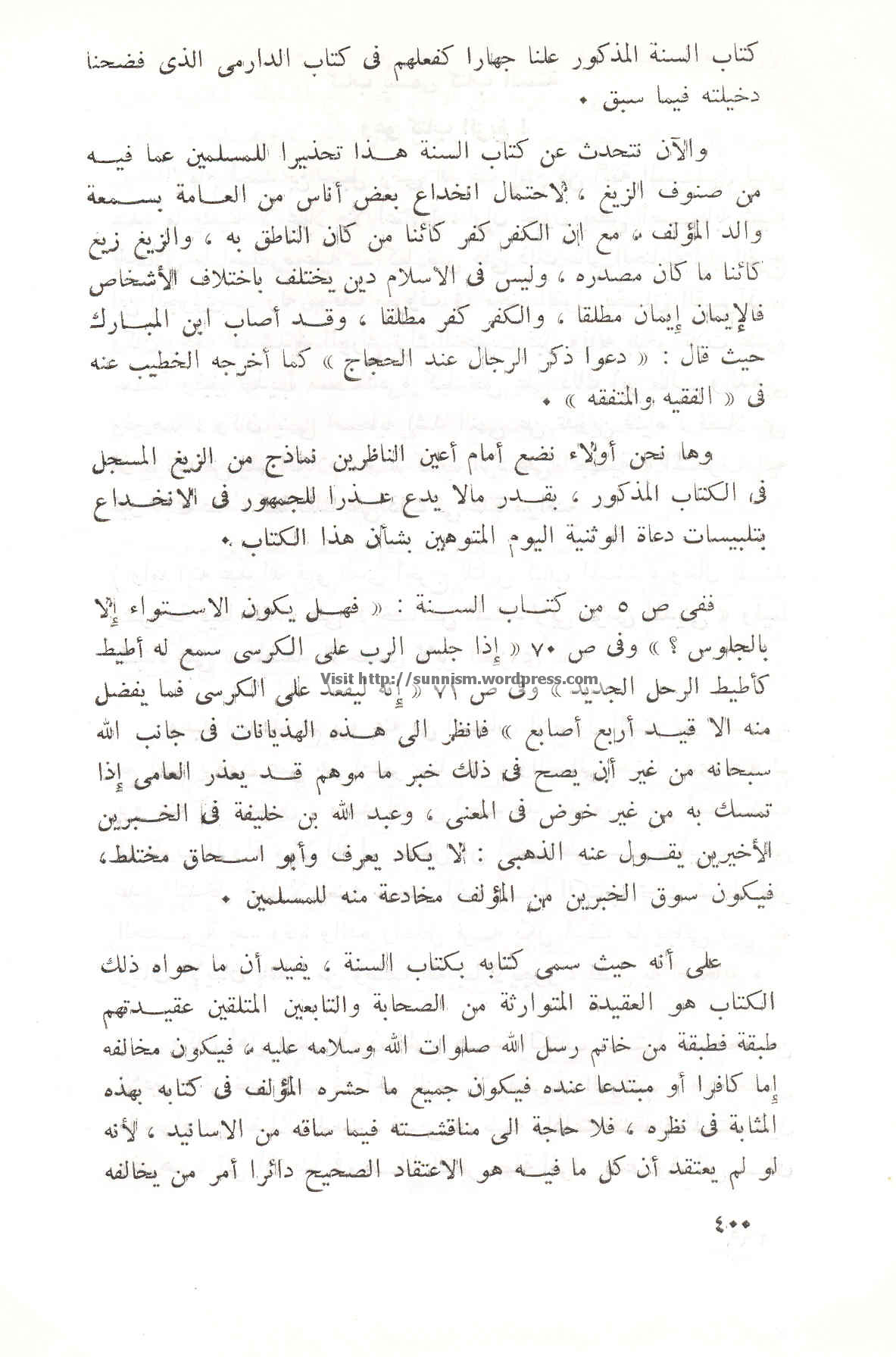 „Nun werden wir über das Buch Kitab as-Sunnah diskutieren, und dies ist eine Warnung der Muslime gegen dass was (in diesem Buch) hinsichtlich der Irreführung steht, weil es passieren mag, dass einige Laien getäuscht werden, wenn sie den Namen vom Vater des Autors hören. [Erklärung: Kitab as-Sunnah ist ein Buch, dass scheinbar vom Sohn des Imam (Ahmad ibn Hanbal) geschrieben wurde. Es enthält viele Aussagen der Irreführung, und dieser übersetzte Paragraph ist der Beginn eines Artikels, den al-Kawthari dem Untersuchen dieses Buches gewidmet hat. Zum Beispiel wird in diesem Buch erwähnt, dass der Begriff „istiwa“ keine andere Bedeutung als „julus“ hätte (d.h. sitzen, obwohl ein schneller Blick in das Arabische Wörterbuch aufzeigen wird, dass in Wirklichkeit „Istiwa“ mehrere Bedeutungen hat…), dass Allah angeblich auf dem Kursi sitzen würde, und dass dabei ein knarrendes Geräusch gehört werde, dass Allah zum Propheten Musa „mit seinen Lippen“ gesprochen hätte (a’udhu billaah!), dass Allah die Tawrah geschrieben hätte, während Er sich an einem Felsen anlehnte und dass dabei das Geräusch des Stiftes gehört werden konnte (a’udhu billaah!), dass Allah Adam berührt hätte, und viele andere Kufr Aussagen! Ende der Erklärung] Jedoch bleibt Unglaube – Unglaube, wer auch immer diese Person sein mag die ihn ausspricht. [al-kufr kufr kaa’inan man kaana an-Naatiq bihi], und Irreführung bleibt Irreführung, unabhängig von ihrer Quelle. Es gibt im Islam nicht einen Glauben, der sich ändert, wenn sich die Menschen ändern. In Wirklichkeit, ist der Glaube – Glaube in einer absoluten Art, und Unglaube ist Unglaube in einer absoluten Art [wa laysa fi-l islaami deen yakhtalif bi-ikhtilaaf al-ash-khaas, fa-l’imaan imaan mutlaqan, wa l-kufr kufr mutlaqan].“
