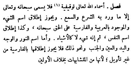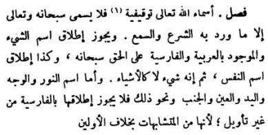 “Die göttlichen Namen sind nur jene die offenbart wurden, daher darf man Allah keine Namen zuschreiben, es sei denn es ist durch die Offenbarung und das heilige Gesetzt gekommen (shari‘a). Es ist erlaubt in Bezug auf Allah die Terme ‘‘Etwas‘‘ (shay‘) oder ‘‘Existenz‘‘ (mawjud), sowohl in arabischer als auch in persischer Sprache, zu verwenden. Dasselbe gilt für den Term ‘‘Nafs‘‘. Allah ist “Etwas“ jedoch nicht wie die anderen Dinge. Was die Terme nūr (licht), wajh (wörtl. Gesicht), yad (wörtl. Hand), ʿain (wörtl. Auge), janb (wörtl. Seite) und dergleichen angeht, so darf man diese nicht in der persischen Sprache, ohne sie zu interpretieren, in Bezug auf Allah verwenden, denn sie sind von den unklaren Termen (mutashābihāt), konträr zu den ersten zwei Termen (d.h. ‘‘Etwas‘‘ und ‘‘Existenz‘‘).“