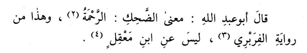 ‘‘Abu Abdullah (al-Bukhari) sagte: „Die Bedeutung von „Lachen“ lautet Gnade.“ Dies ist von der Überlieferung von Farabri, nicht von Ibn Ma‘qil.‘‘