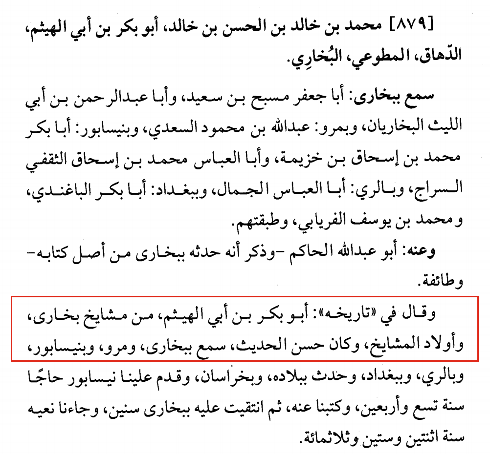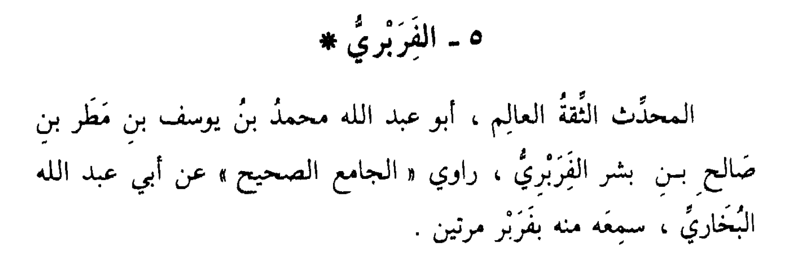 ‘‘Der Vertrauenswürdige Muhaddith, der Gelehrte, Abu Abdullah Muhammad ibn Yusuf ibn Matar ibn Salih ibn Bishr al-Farabri, ein Überlieferer (von dem Sahih) von Abu Abdullah al-Bukhari. Er hörte von ihm (den ganzen Sahih) zweimal in Farbar.‘‘