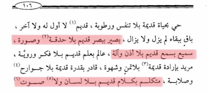 “Er ist al-Awwal vor allem, ohne eine ḥadd (Grenze), und al-Akhir nach allem, ohne ein Ende. Und dieses wurde nur als solches gesagt, weil Er existierte, als nichts anderes als Er existierte und Er wird (weiterhin) existieren nachdem alles vergangen ist wie Allah sagte: Alles wird vergehen außer seinem Wadjh.“
