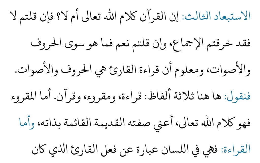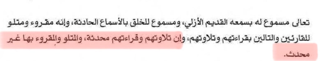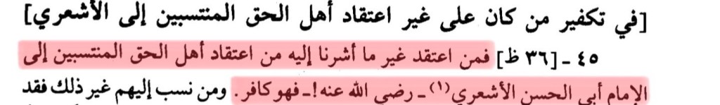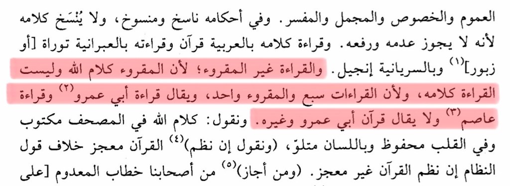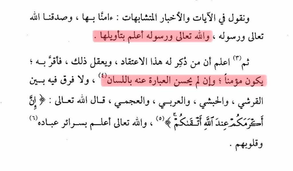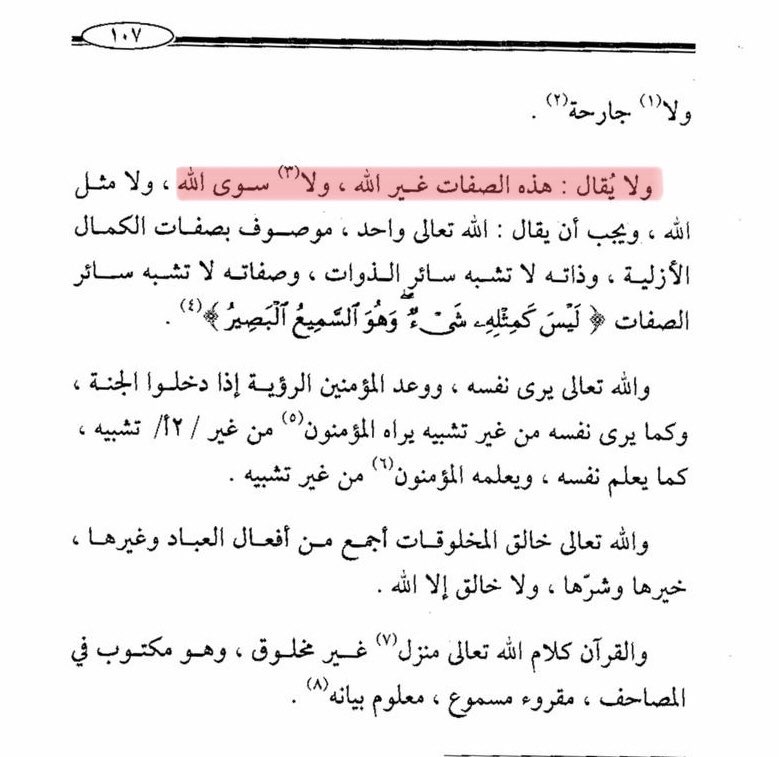 „Die Eigenschaften Allahs können nicht mit den Eigenschaften der Geschöpfe verglichen werden, so wie Allah Sprechender ist ohne Hilfsmittel, Zunge, Lippen so wie Geschöpfe es tun… Es ist nicht erlaubt Allahs Rede mit der Rede der Geschöpfe zu vergleichen, denn es kann nicht existieren außer mit Hilfsmittel und Allah der Allmächtige redet wie er beabsichtigt ohne Hilfsmittel, ähnlich sein Nuzul ist ohne Hilfsmittel, ohne Bewegung und ohne Übergang von Ort zu Ort, ähnlich zu dem ist das Hören und Sehen,… Er sieht wie er beabsichtigt ohne Hilfmittel und hört ohne Ohren… Und stattdessen hört Er wie er beabsichtigt ohne Hilfsmittel, Er tut Nuzul, wie er beabsichtigt, ohne Hilfsmittel ; es ist nicht mit dem herabsteigen von Geschöpfen zu vergleichen.”