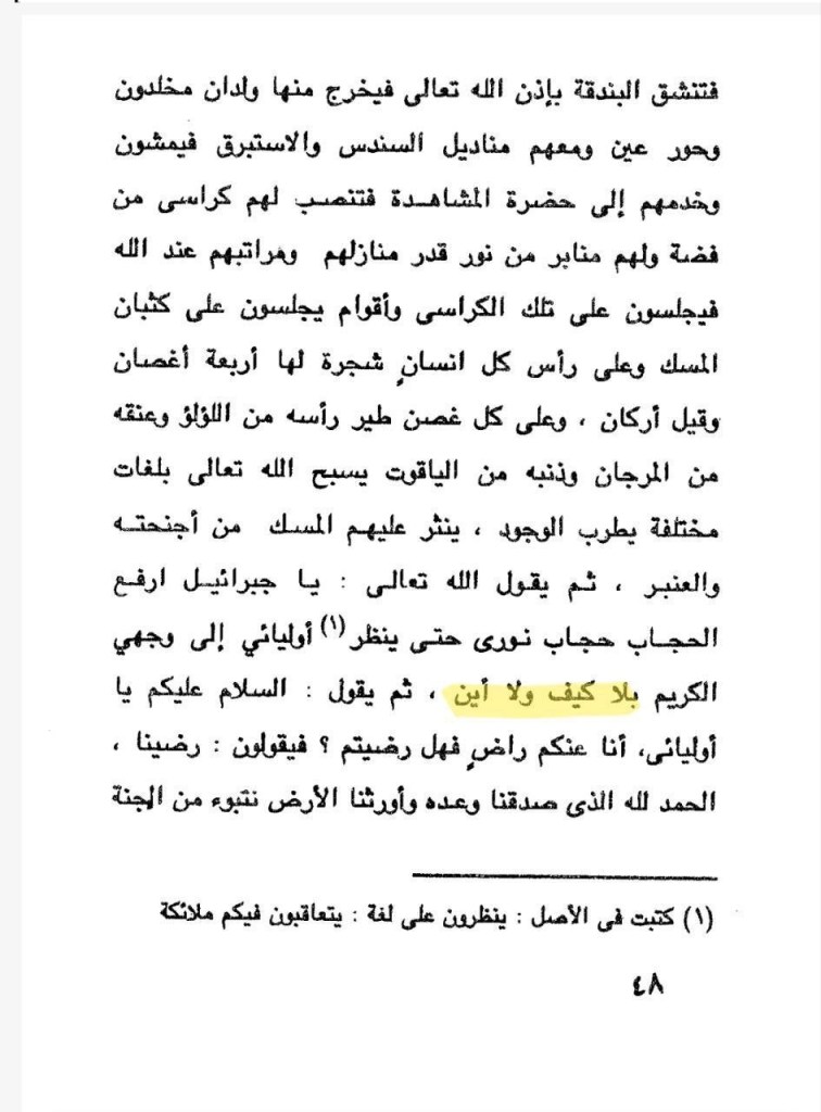 ‘‘Und dass ist ohne Tajsim in Bezug auf Allah und ohne Ihm (Allah) Grenzen zuzuschreiben. Jedoch werden sie Ihn mit ihren Augen sehen, so wie Er (Allah) will und ohne Modalität.‘‘
