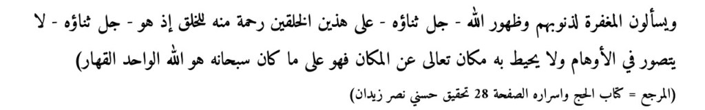 „Der Nuzūl (das Herabkommen) und der Madjī’ (das Kommen) sind zwei Eigenschaften, die mit der Bedeutung von Bewegung und Transport von Ort zu Ort, abgelehnt sind in Bezug auf Allāh. Vielmehr sind sie zwei Eigenschaften von den Eigenschaften Allahs ohne Verähnlichung (tashbih). Allah ist hoch erhaben über das was die Mu‘atilah (Negierer der Eigenschaften) und Mushabbiha (Verähnlicher Gottes) sagen.“