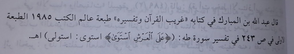 Abdullāh bin Yahyā Al-Mubārak al-Yazīdī, (verst. 237 n.H.) und er ist ein Spezialist in der arabischen Sprache, welcher anerkannt ist bei den Gelehrten der Ahlu Sunnah, er sagte über den Istiwā in Sūrah Tāhā in seinem Tafsir S.243: „… istiwa: Istawlā“