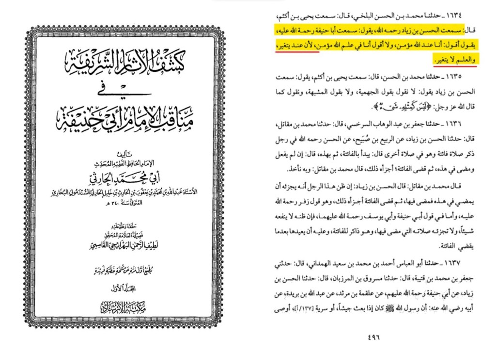 Imam al-Hasan bin Ziyad sagte, ich hörte Abu Hanifa sagen: „Ich sage, ich bin ein Gläubiger bei (‚inda) Allah, ich sage nicht, ‚Ich bin ein Gläubiger in dem Wissen von Allah, denn das ‚inda verändert sich jedoch das Wissen (von Allah) verändert sich nicht.“