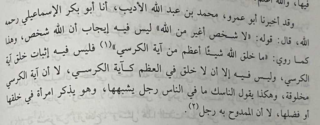 Abu Bakr al-Isma’ili (277-371 n.H.) lehnte in I‘tiqad A‘immat Ahl-Hadith den Körper sowie die Grenzen in Bezug auf Allah ab, er sagte: