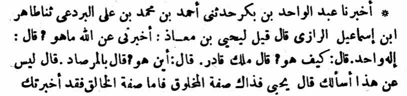 al-Imām Abū Nuʿaym al-Aṣbahānī überliefert, dass Yaḥyā b. Muʿādh gefragt wurde: “Informiere mich über Allāh.” Er sagte: “Der eine Gott.” Es wurde gesagt: “Wie ist Er?” Yaḥyā sagte: “Ein König, Allmächtig.” Es wurde gesagt: “Wo ist Er?” Yaḥyā sagte: “Er ist stets wachsam.” Der Fragende sagte: “Ich frage dich nicht darüber!” Yaḥyā sagte: “Das ist die Eigenschaft der Geschöpfe! Bezüglich der Eigenschaft von dem Erschaffer, so ist es wie ich dir berichtete!”