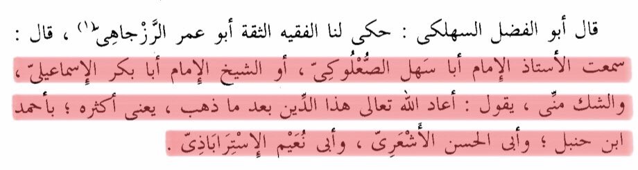 „Allah belebte diese Religion wieder, nachdem ein Großteil davon verschwunden war, durch Aḥmad b. Ḥanbal, Abū al-Ḥasan al-Ashʿarī und Abū Nuʿaym al-Istarābādhī.“